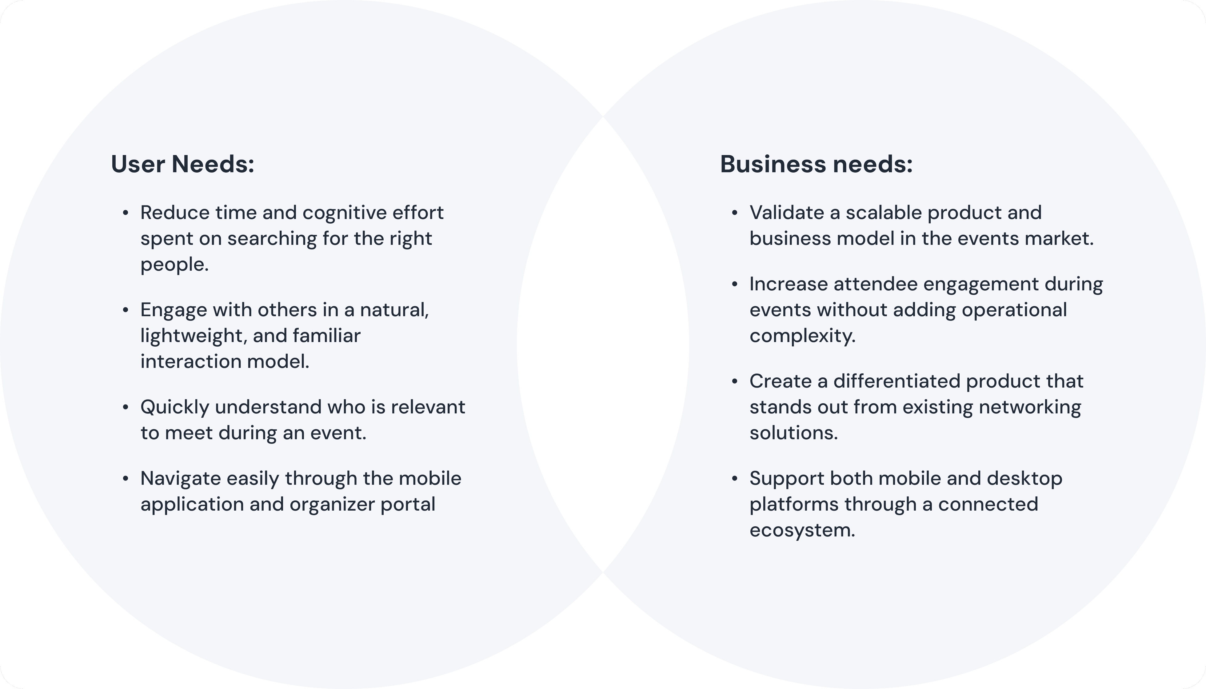 While early ideas and market research existed, a key insight emerged: attendees often lose time and attention during events, making it difficult to stay engaged and connect with the right people. Our challenge was to design a mobile-first solution that helped users engage more meaningfully during events while reducing the friction of finding and connecting with relevant people.