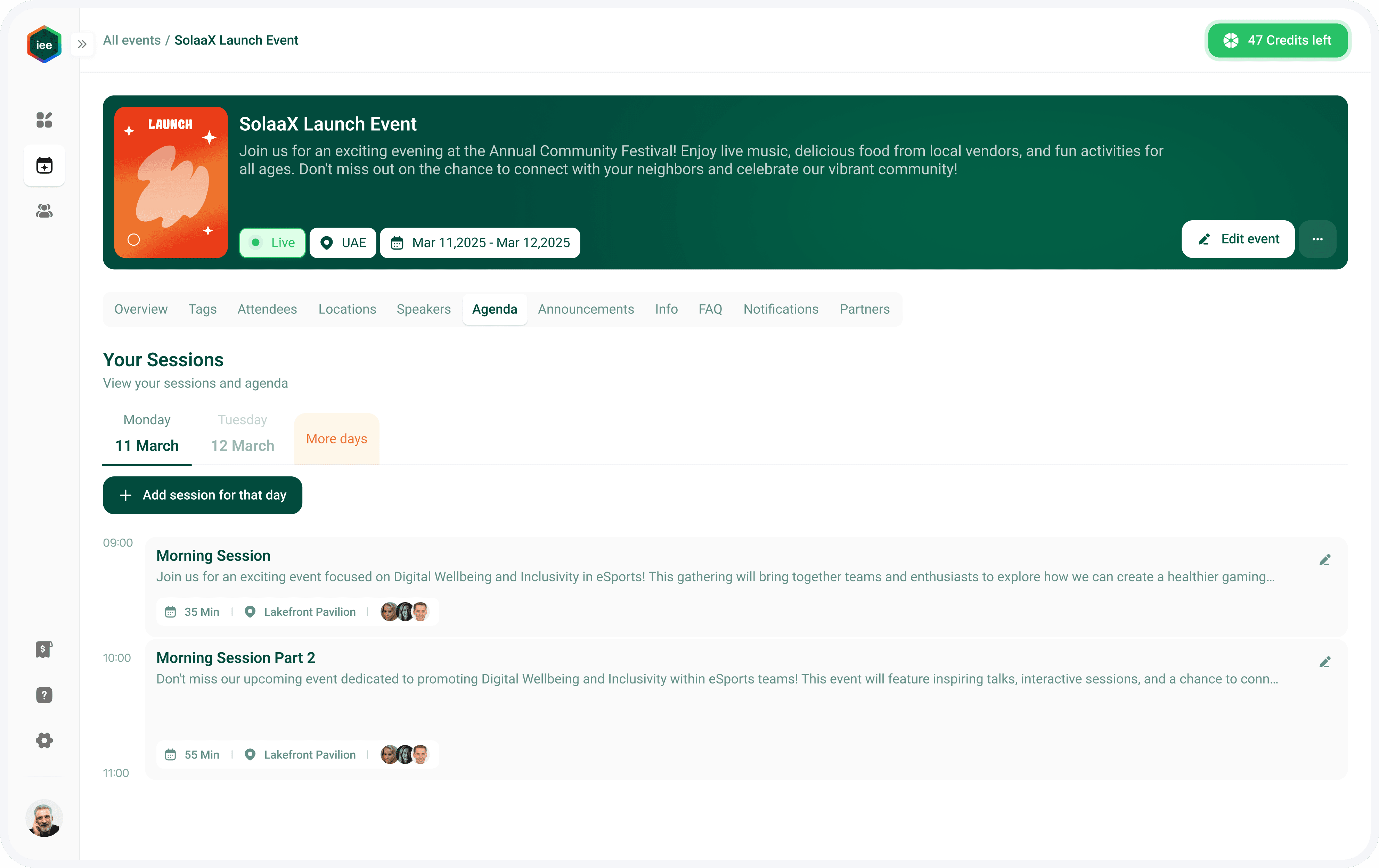 To solve this, we introduced a personal agenda within the mobile application that centralized event sessions users planned to attend alongside meetings scheduled with other attendees. This allowed users to manage their time more effectively, avoid missing important sessions, and keep track of planned connections in one place.