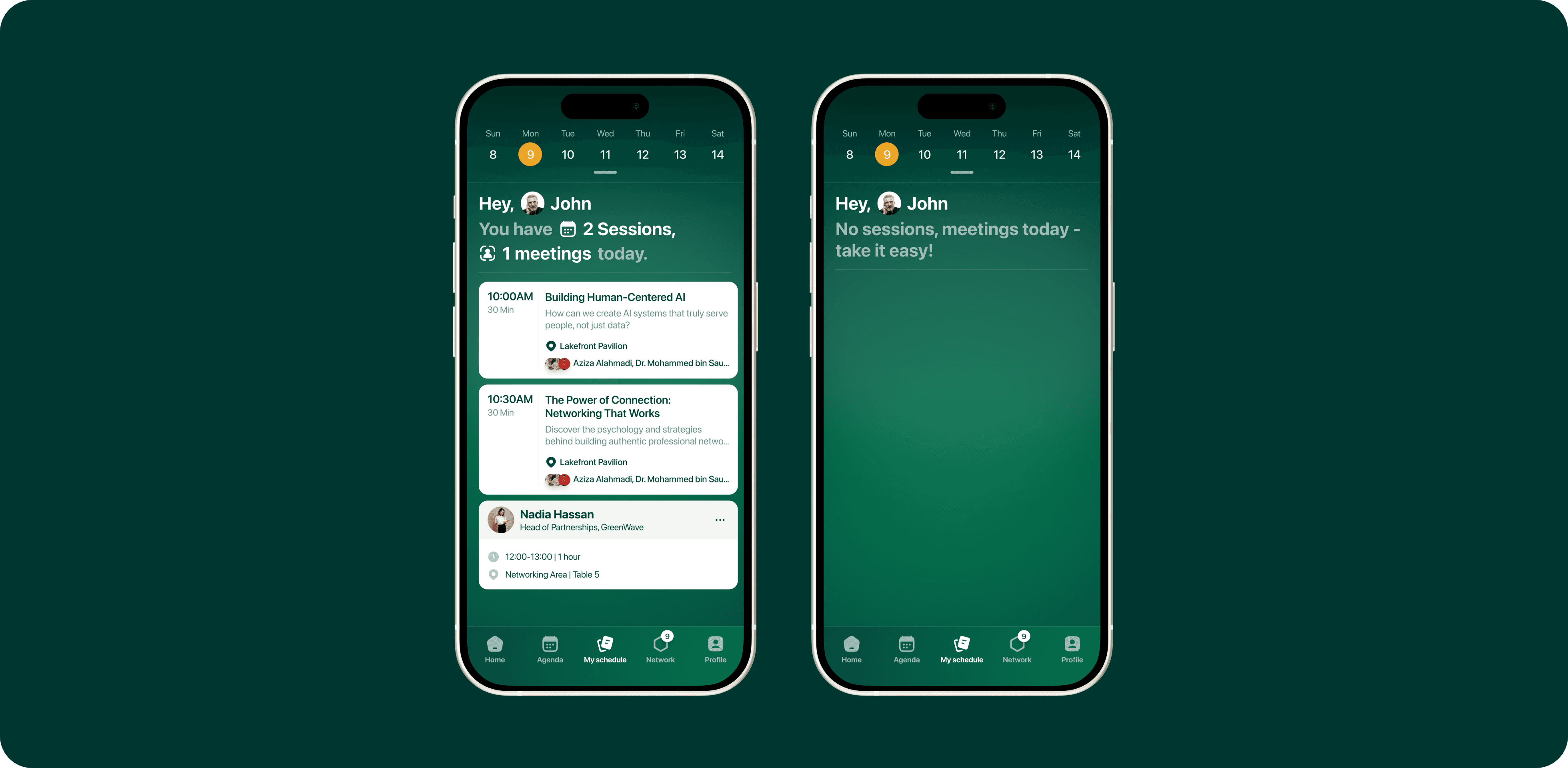 This approach gave organizers flexibility while keeping the mobile experience clear, focused, and adaptable to different event formats without increasing complexity for attendees.