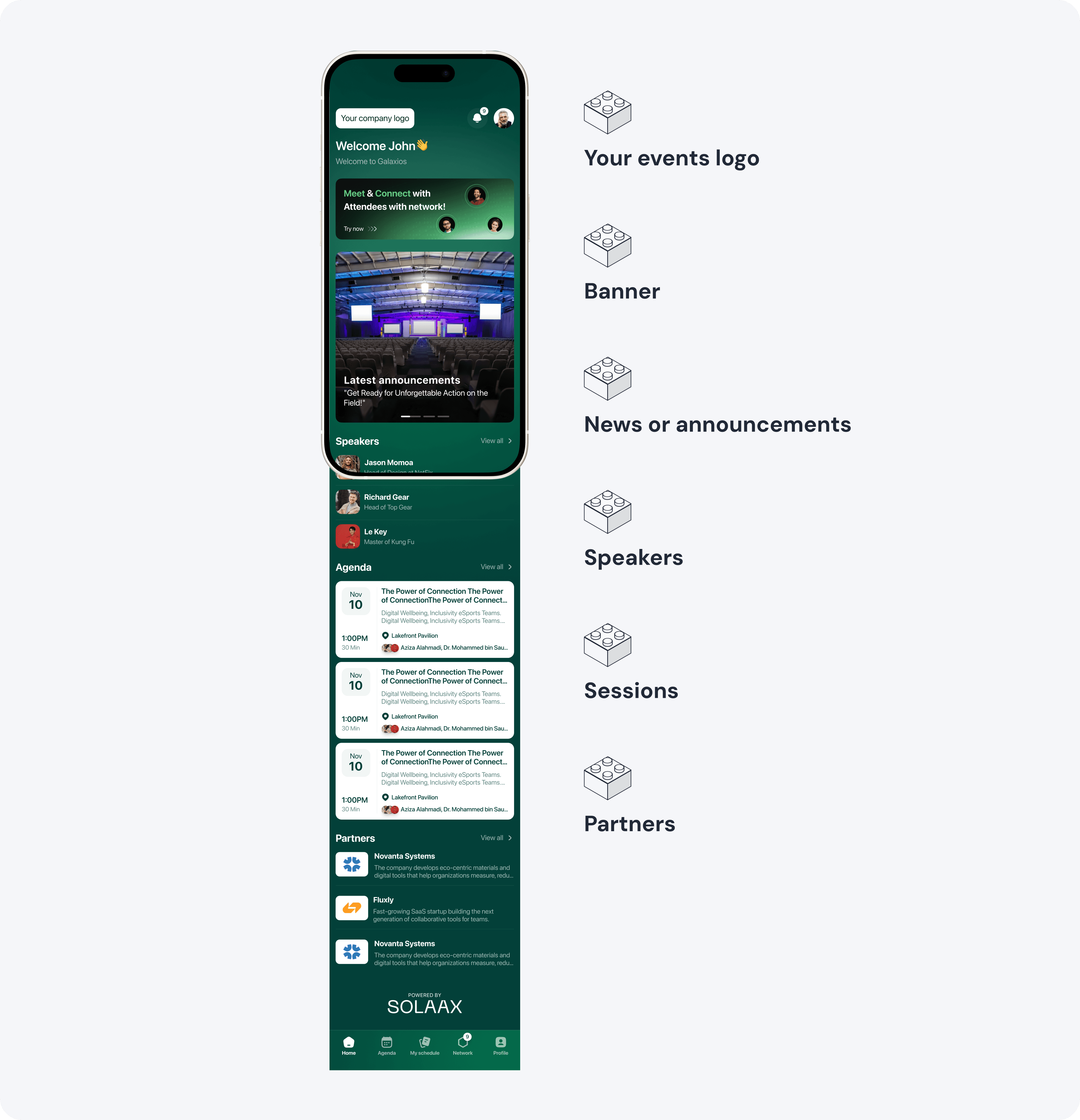 To address this, the main mobile screen was designed as a modular system built from configurable blocks. These blocks could be assembled and customized through the organizer portal on desktop, allowing each event to surface only the most relevant information and features for its audience.