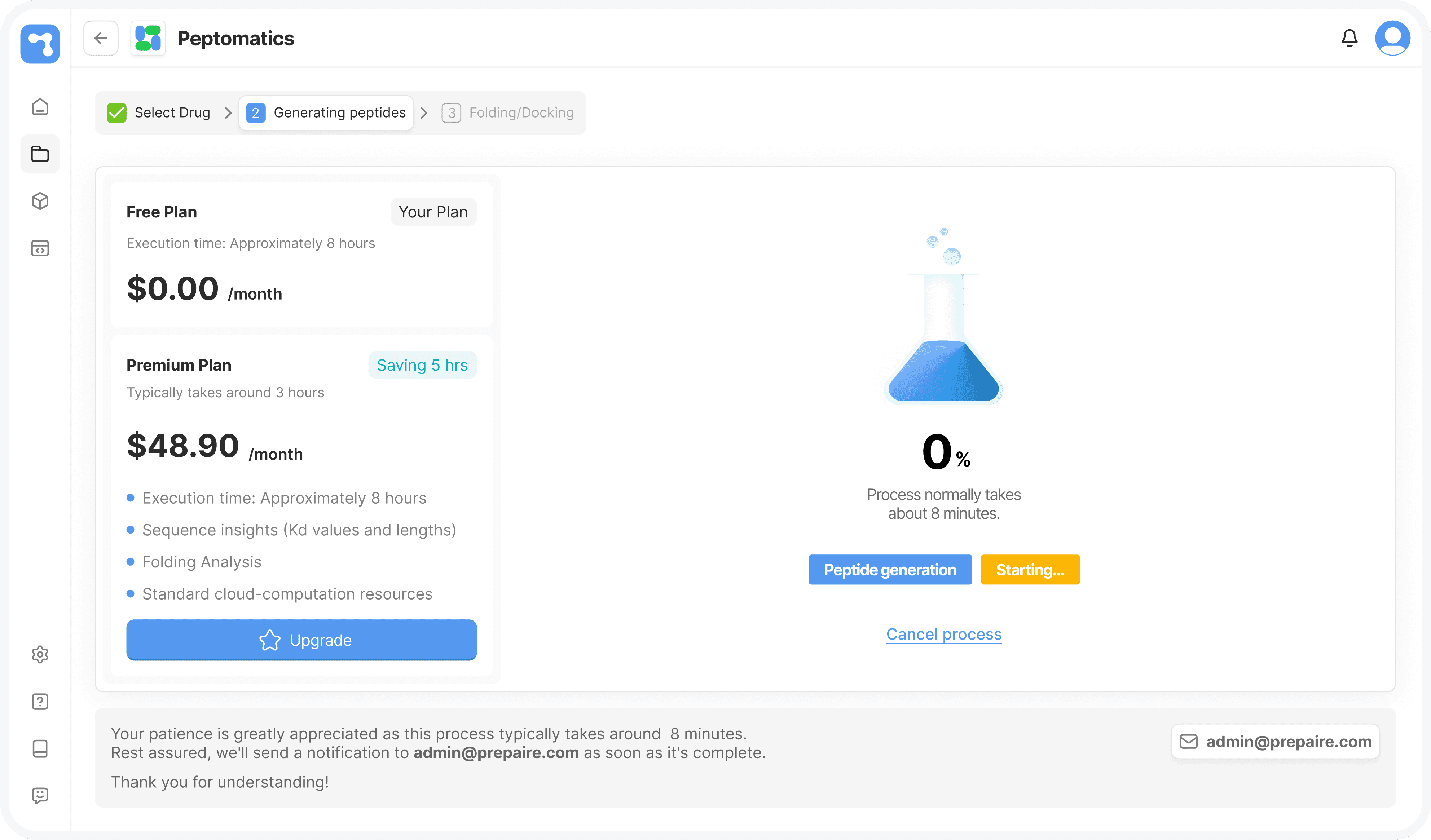 By simplifying navigation, clarifying terminology, and unifying complex tools such as AlphaFold, ESM Fold, and DiffDock into focused flows, the product enabled faster experimentation and more confident decision-making in peptide-based drug research.