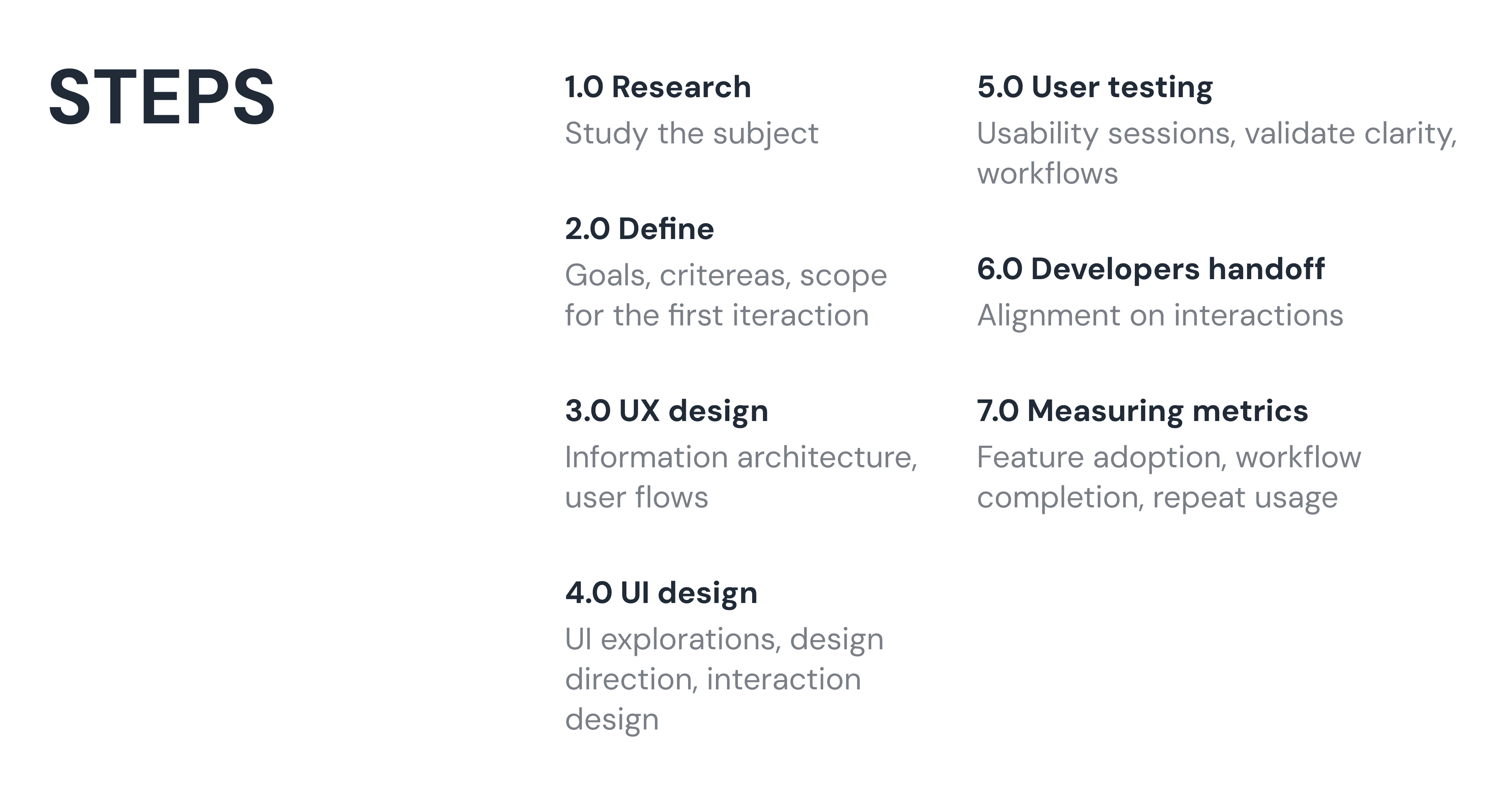researching the subject matter, defining goals, criteria, and scope for the first iteration, shaping the UX through information architecture and user flows, and then moving into UI exploration, interaction design, and visual direction. Each cycle included user testing, developer handoff, and metric definition to support continuous validation and improvement.